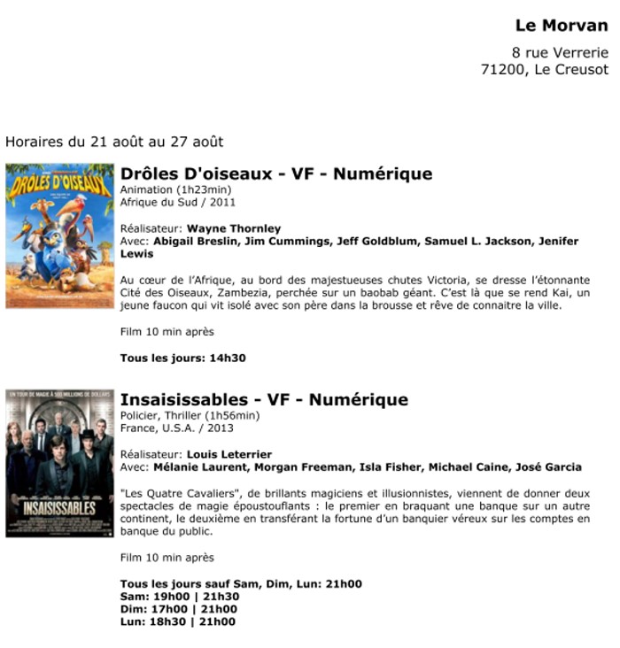 A l'affiche, cette semaine (du 21 au 27 août 2013)