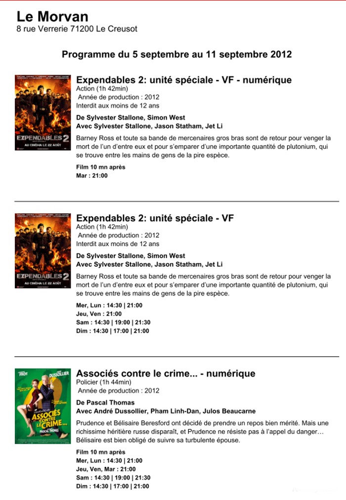 A l'affiche, cette semaine (du 5 au 11 septembre 2012)