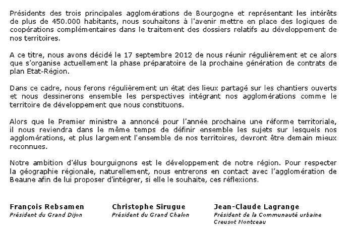 Grand Dijon, Grand Chalon et communauté urbaine Creusot Montceau.