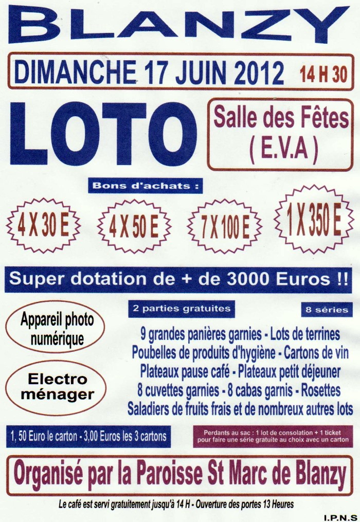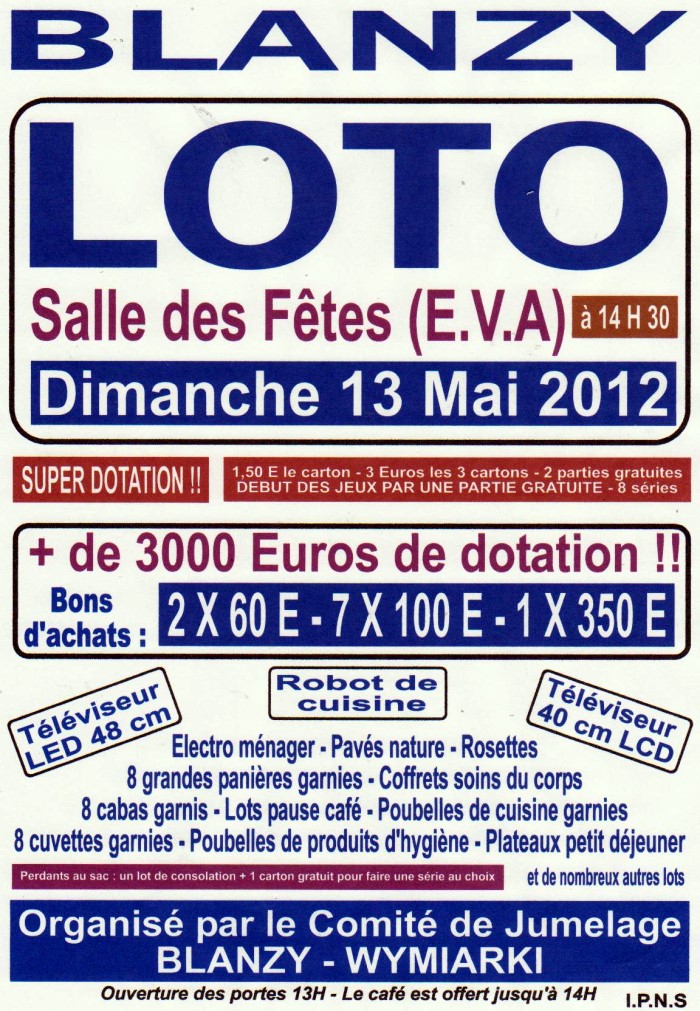 Grand loto (plus de 3 000 €) de dotation, le lundi 28 mai 2012
