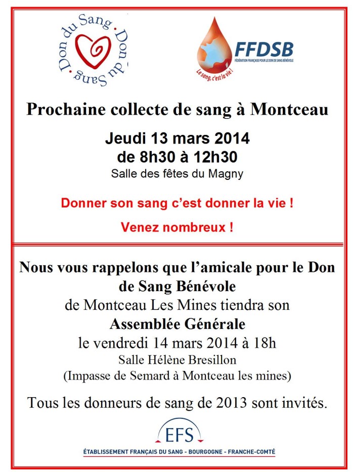 Collecte ce jeudi 13 mars 2014 à la salle des fêtes du Magny