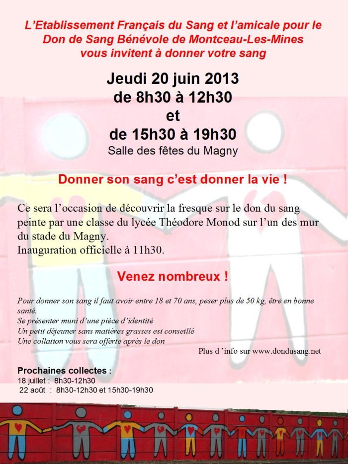 Collecte ce jeudi 20 juin 2013 à la salle des fêtes du Magny