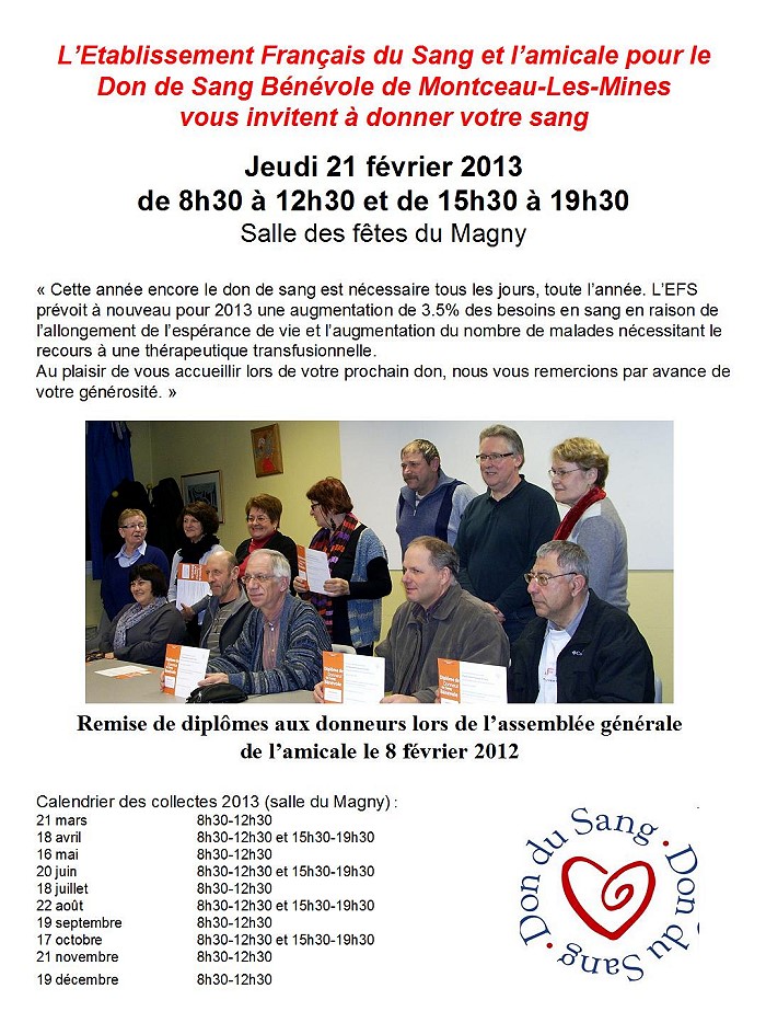 Collecte le jeudi 21 février 2013 à la salle des fêtes du Magny