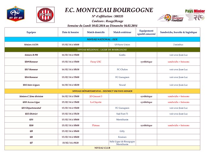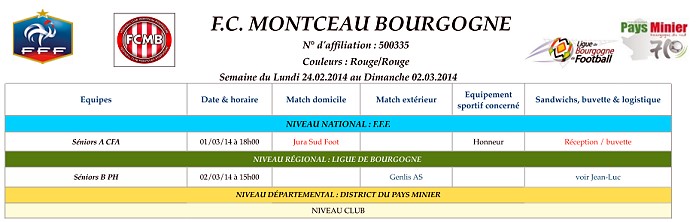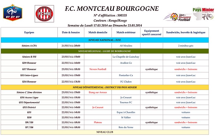 Le programme du prochain week-end : 15 et 16 mars 2014