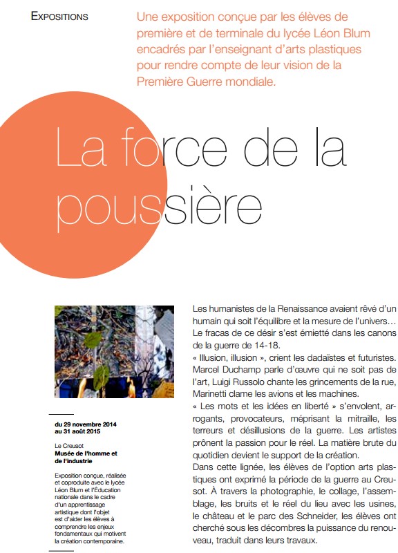 « La programmation scientifique et culturelle de l’Écomusée de la communauté porte, cette année encore, la promesse d’intenses moments de découverte, d’émotion et de réflexion. Articulée autour de la notion d’espace(s), elle en développe deux aspects aussi irréconciliables que le bien et le mal, l’obscurité et la lumière. La dimension infernale, insoutenable de l’espace, renvoyé aux marches de l’indicible, est symbolisée par les tranchées de la Première Guerre mondiale où règnent la promiscuité, la crispation et la peur.