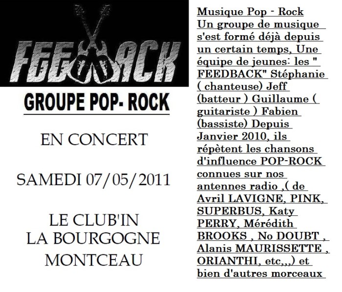 Concert des FEEDBACK au Club’in La Bourgogne samedi 07 mai 2011 à partir de 21 h 30 pour 2 H 00 de concert.
