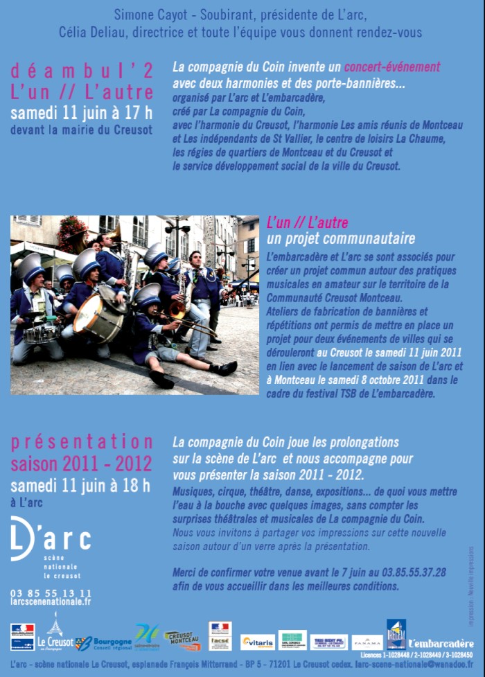 Les harmonies du Creusot, de Montceau (« Les amis réunis ») et de Saint-Vallier participeront au concert -animation, proposé ce samedi 11 juin 2011 devant la mairie du Creusot par L’arc et L’Embarcadère, spectacle intitulé « Déamul’2 L’un // L’autre ».