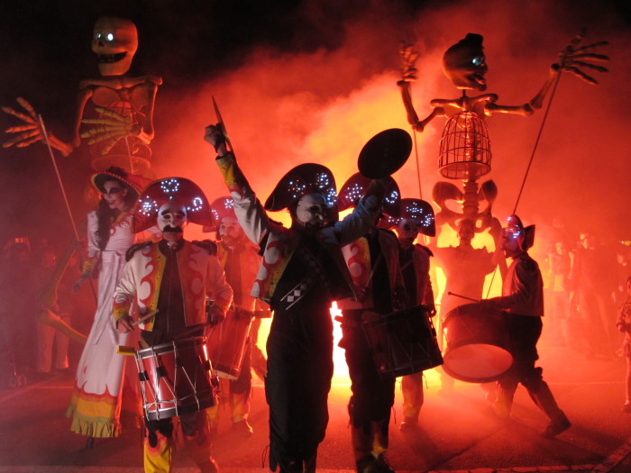 Imaginiez-vous, un jour, croiser la Mort au détour d’une rue ? Il s’agit de cette femme sans âge, à la beauté farouche, drapée dans ses plus beaux atours. Entre digitale et belladone, elle a le charme des poisons exquis. Ce jour là vous serez mille, peut être plus. Mais c’est vous qu’elle verra. Ne craignez rien, elle fera les premiers pas. Tango, tarentelle ou rumba, elle mènera la danse. Accompagnée de sa horde de tambours d’ordonnance et de ses terrifiants gardes du corps, elle est prête à se livrer à la plus lascive des parades nuptiales pour vous séduire, vous ou votre voisin… Abandonnez-vous, sortez vos tripes et lâchez votre corps. L’enjeu est colossal, démoniaque, géant, car si vous lui plaisez, la Mort vous emmènera chez elle dans ses appartements, vous pénétrerez l’au-delà de votre vivant. Et vous, humble mortel, de vos yeux et de vos oreilles de bon vivant, vous pourrez espionner ce monde tant redouté qu’est l’empire du trépas. Et ça c’est mortel !