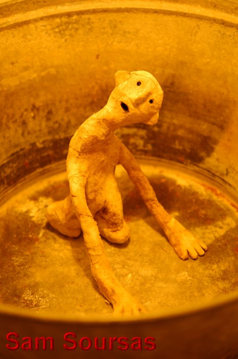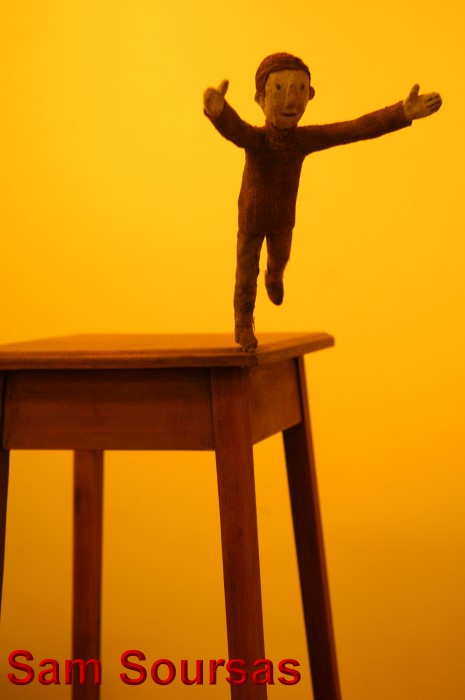 De minuscules personnages en pâte à modeler ou terre-cuite nous observent dissimulés derrière des rouleaux de papier-bulles ou depuis une gamelle en métal. La sensation d’être des géants nous envahie alors. Ici, des rochers de toutes tailles à visages humanoïdes sont empilés, avec un équilibre défiant les lois de la gravité, jusqu’à plus de deux mètres de hauteur! Là, c’est un véritable mur qui s’impose à nous mélangeant sculptures, peintures et dessins. Notre sensation de gigantisme disparaît alors subitement!