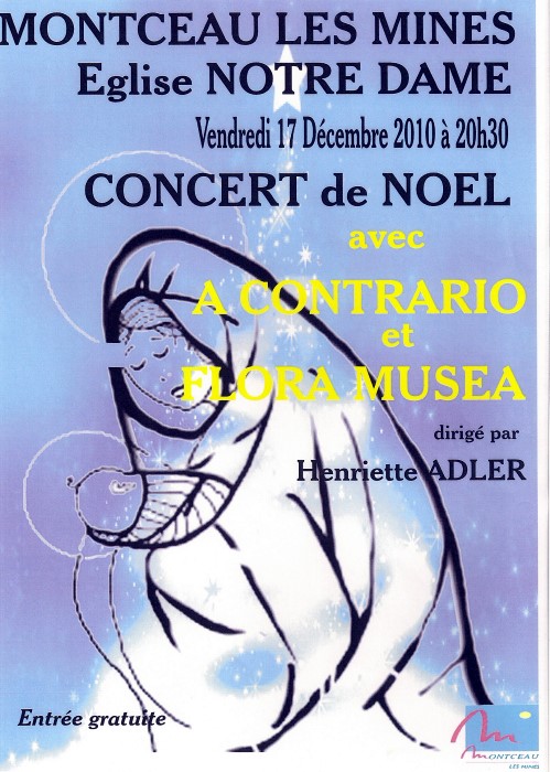 L’ensemble vocal Flora Musea de Montceau, donnera le vendredi 17 décembre à l’église Notre-Dame de Montceau à 20 H 30 un concert de Noël. Il sera placé sous la direction d’Henriette ADLER, sa directrice musicale depuis septembre 2009.