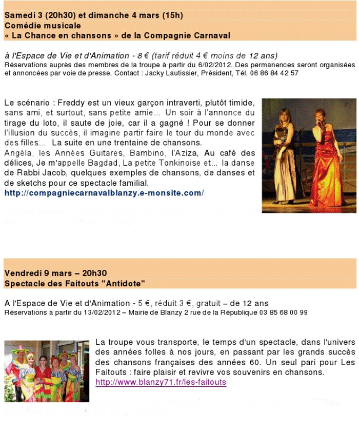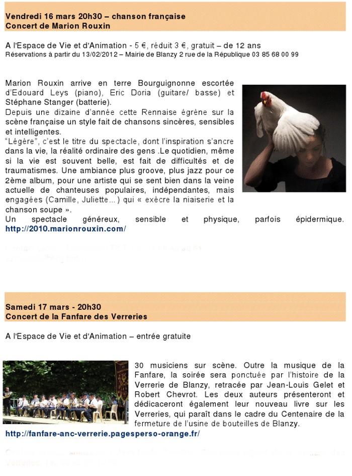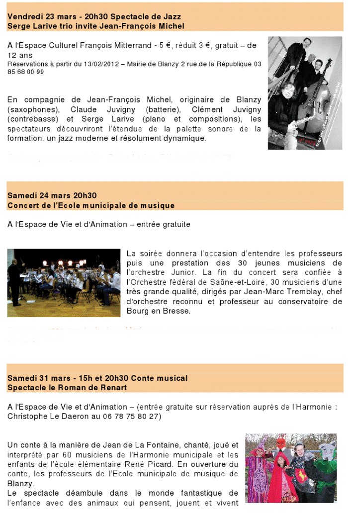 La Culture à Blanzy est portée aussi bien par les associations que par la Municipalité qui développe depuis quelques années un véritable programme culturel. La preuve avec le festival « Blanzy en mars, en famille » qui commencer asamedi prochain, 3 mars 2012.
