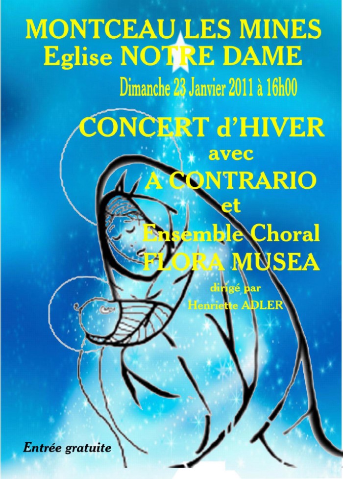 L’ensemble vocal Flora Musea de Montceau, donnera le 23 Janvier à l’église Notre-Dame de Montceau à 16 heures un concert de Noël. Il sera placé sous la direction d’Henriette ADLER, sa directrice musicale depuis septembre 2009.