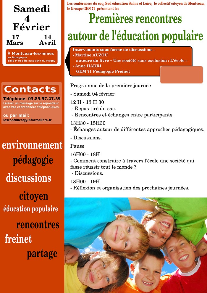 Les premières rencontres autour de l’éducation citoyenne auront lieu à Montceau-les-Mines de février à avril 2012 ; la date de la première journée étant fixée au samedi 4 février.