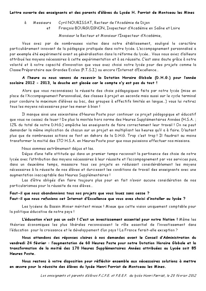 Les enseignants et les parents d’élèves F.C.P.E. et P.E.E.P. du Lycée Henri Parriat de Montceau les Mines ont adressé, une lettre ouverte, ce lundi 20 février 2012, à Monsieur Cyril NOURISSAT, Recteur de l’Académie de Dijon et à Monsieur François BOURGUIGNON, Inspecteur d’Académie de Saône et Loire.