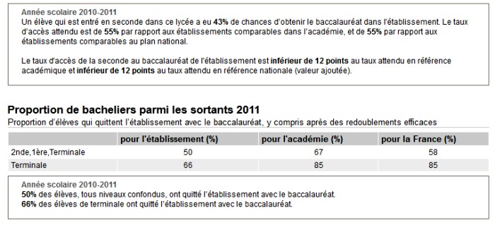 Ce mercredi, le ministère de l’Education nationale a publié les indicateurs de résultats des lycées 2011. Ces trois indicateurs permettent d’évaluer l’action propre de chaque lycée. Ils sont établis à partir des résultats des élèves au baccalauréat et de leur parcours scolaire dans l’établissement. Les lycées d’enseignement général et technologique et les lycées professionnels, publics et privés sous contrat, sont concernés.