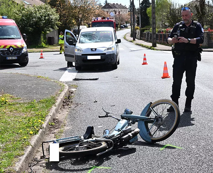 Il était un peu plus de 12h15 quand l’alerte a été donnée : Une collision entre une voiture et un cyclomotoriste venait de se produire à l’angle de la rue de Volnay et de la rue de la Mouillelongue au Creusot.
