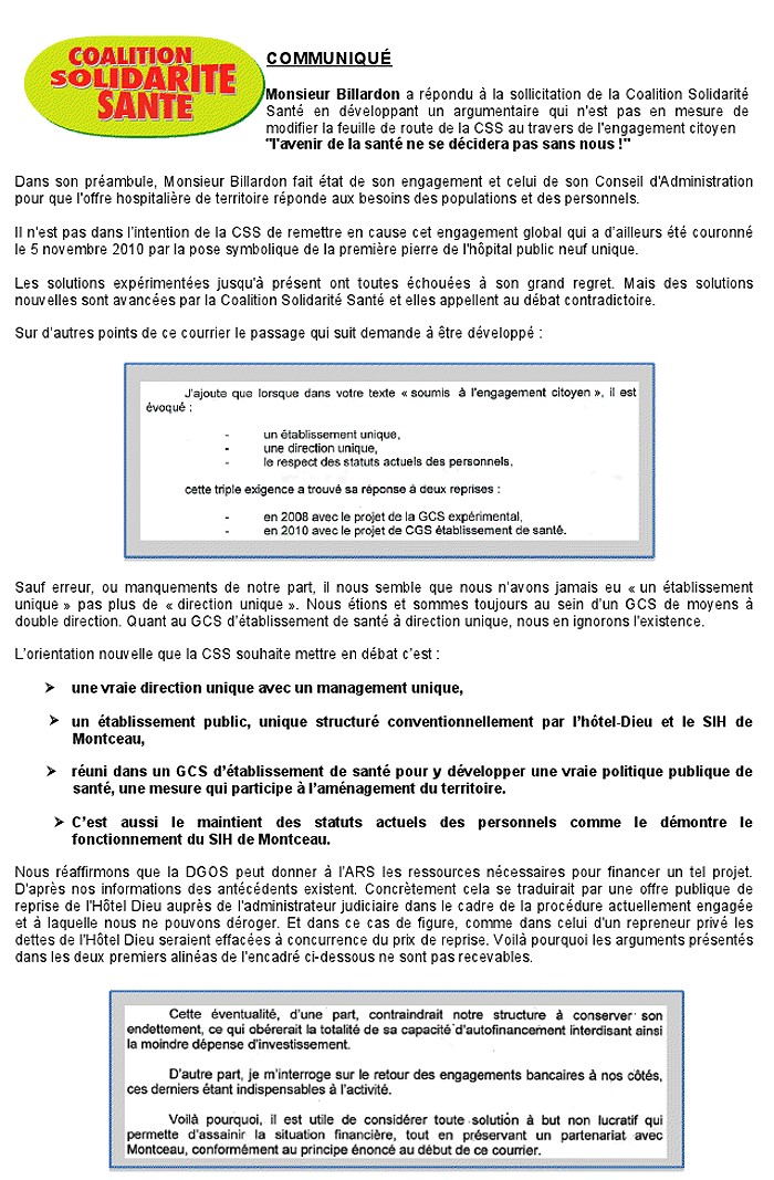 La correspondance entre la CSS et M. André Billardon, président du C.A. de l'Hôtel-Dieu du Creusot