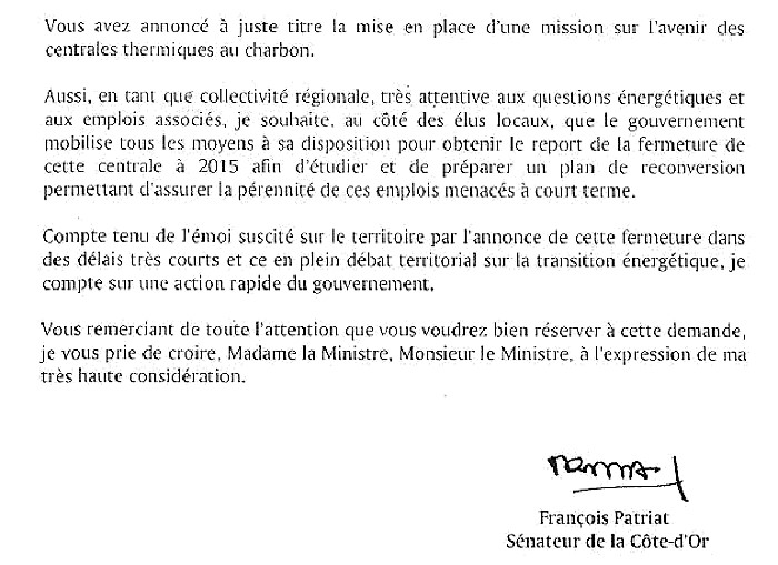 François Patriat, président du Conseil régional, a également adressé un courrier à Delphine Batho et Arnaud Montebourg.