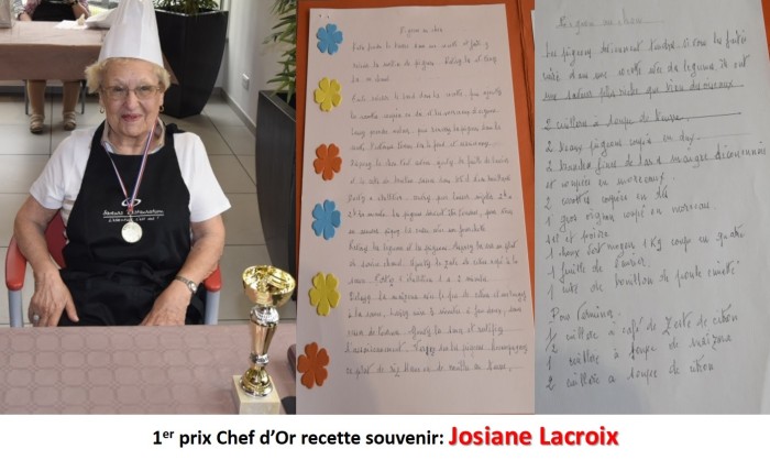 Que chacun dans son coin tente l’exercice, ce n’est pas gagné d’avance. Pourtant si pour Josiane Lacroix de la résidence Henri Malot qui avec une sublime recette de Pigeon au chou (et une liste complète d’ingrédients avec astuces et consignes) a emporté le prix « Chef D’or » de la recette souvenir. Ses 7 autres concurrents ont présenté aussi des recettes de qualité.