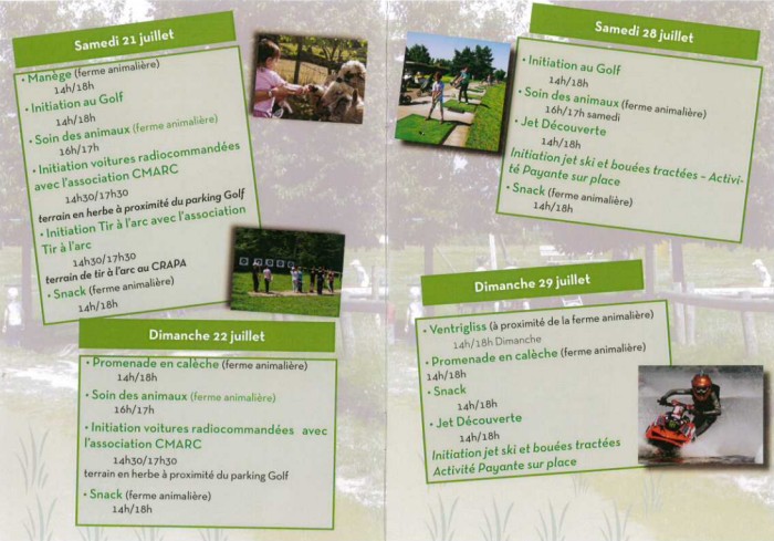 Des activités pour tous, pour toutes les familles : des animations proposées par l’association CMARC ( initiation voitures radio-commandées), le tir à l’arc, du golf ,… et les classiques : le manège, la ferme, la calèche,…