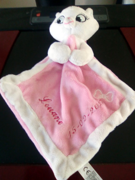 « Hier soir j’ai trouvé un doudou Marie des Aristochats avec prénom et date de naissance de l’enfants qui la perdu