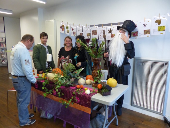 Beaucoup de vie et d’animation ce vendredi à la médiathèque, où plusieurs générations se sont croisées, afin d’admirer herbiers, plantes, poireaux, tomates jaunes, courges, potimarron, pomme de terre, citronnelle et autres aulx (de ceux qui font fuir les vampires).