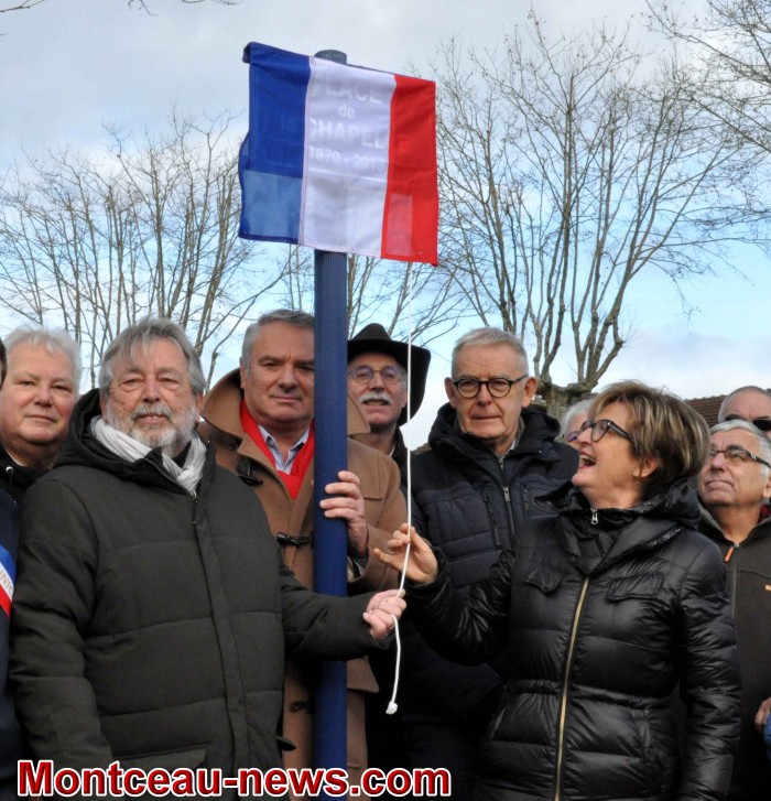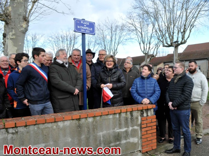 Marie-Claude Jarrot, Maire de Montceau-les-Mines, en présence de plusieurs élus, des membres du conseil des Sages, du CMJ et de l’Association des Amis de la Chapelle du Bois-du-Verne, a inauguré la « Place de la Chapelle » et procédé au dévoilement de la plaque officielle « Place de la Chapelle ».