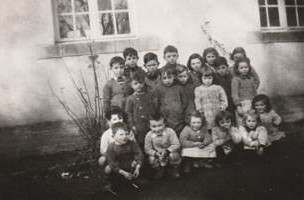 Elèves de la classe de cours préparatoire et cours élémentaires 1 et 2, 1952, photographie prise par M. Quinio, leur instituteur, devant la « baraque » qui leur sert de local (collection musée)