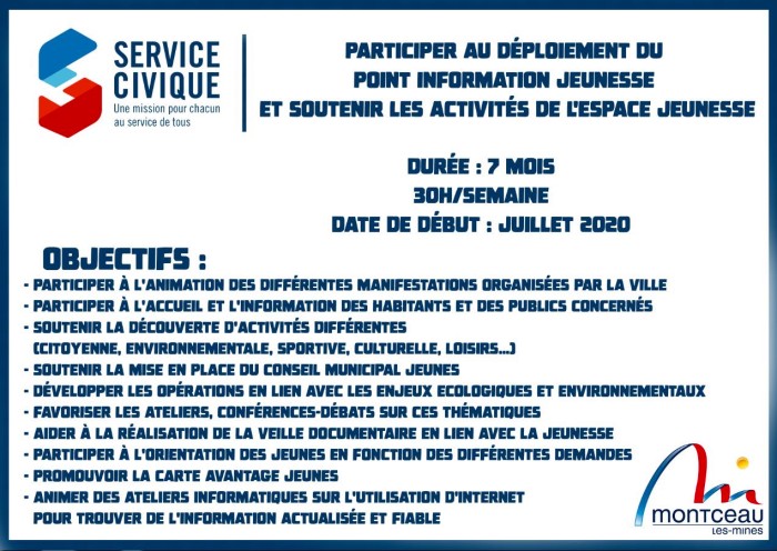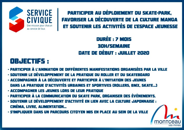 Le Service Jeunesse de la ville de Montceau-les-Mines recherche deux services civiques pour le mois de juillet 2020 afin de développer les animations autour du Skate Park et de la culture japonaise pour l’un et du Point Information Jeunesse pour l’autre.