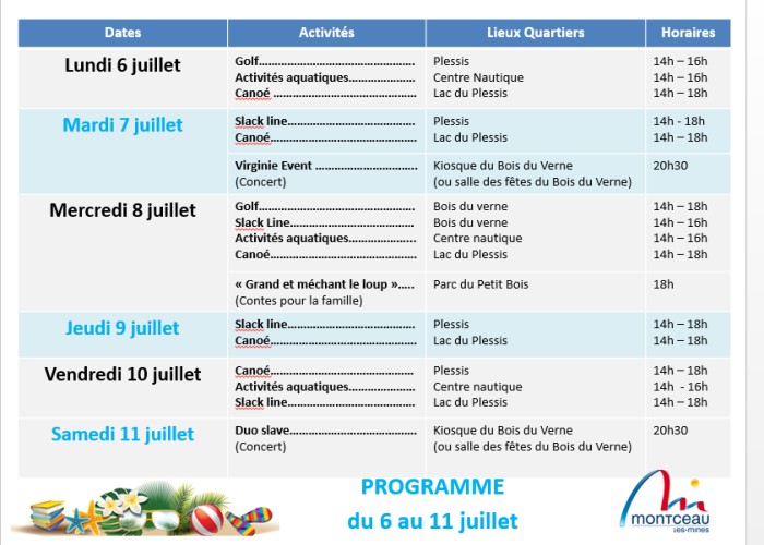 → du 15 juillet au 23 août, durant 6 semaines, chaque jour, des activités seront proposées dans les différents quartiers (par roulement) en plein-air et en journée. En cas de météo incertaine, des solutions de replis seront toujours proposées. En tout, ce seront près de 300 rendez-vous fixés aux habitants sur l’ensemble de l’évènement.