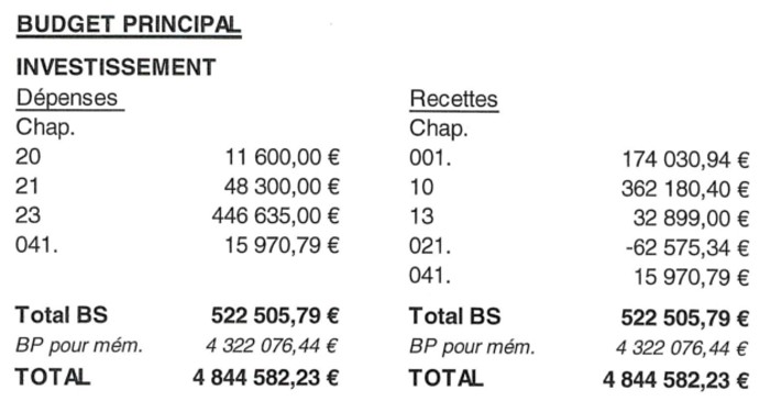Il est proposé au Conseil Municipal d’adopter, par chapitre, les sections de fonctionnement et d’investissement du Budget Supplémentaire 2020 qui s’élève à :