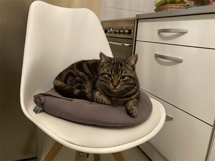Il ne porte pas de collier mais il est pucé. C’est un mâle, non castré, type européen, tigré foncé, yeux verts. Il a 1 an et demi. Il répond plus au nom de « mimi » que du sien.