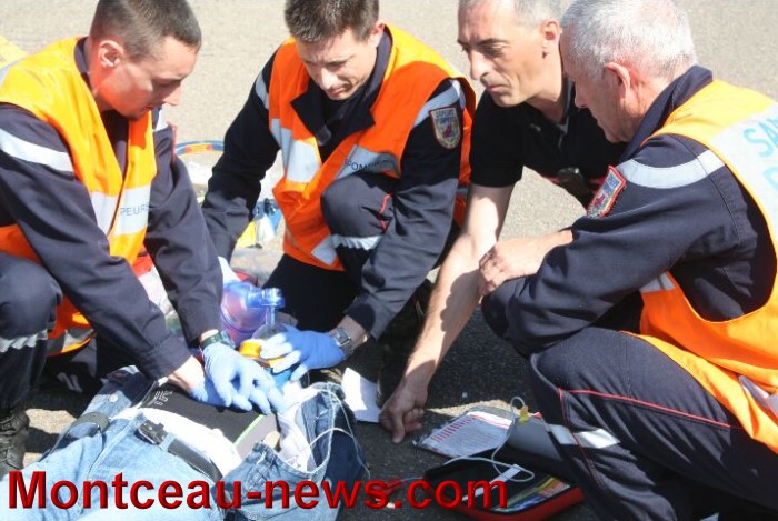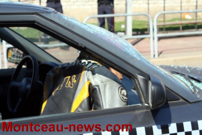 – Enfin, le 2ème accident met en cause 2 voitures , l’une roule normalement, l’autre grille un feu rouge à 50km/h, le passager n’est pas attaché. Il se fracasse sur le par brise…. Et les dégâts sont très importants. Là encore les pompiers interviennent en temps réels.