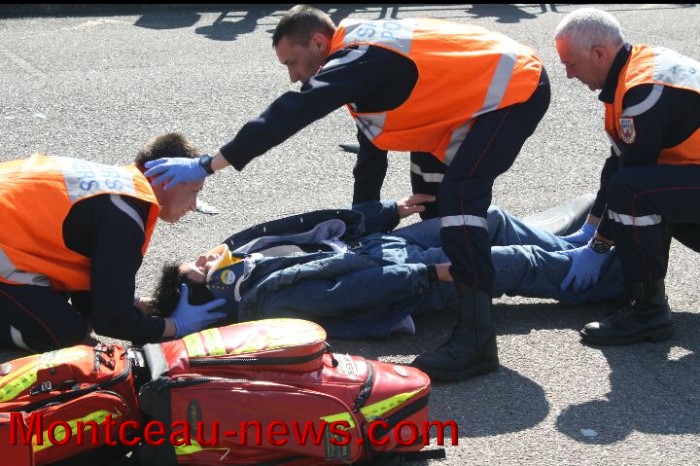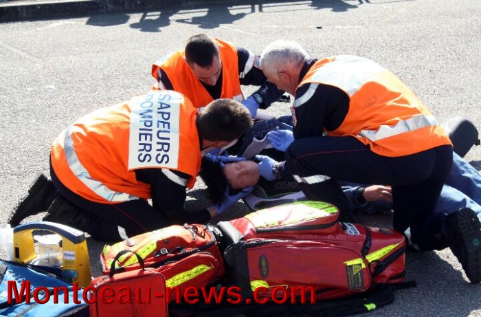 Pascal Dragotto, bien sanglé dans son véhicule joue le rôle du commercial qui grille le stop et percute violemment le scooter où est assis le mannequin. Le choc est effroyable, la victime est projetée sur le pare brise, la dure réalité qui suit est pire encore, un témoin protège les lieux et le blessé, il alerte le 18 , se soumet au questionnement et tente de secourir… les pompiers arrivent, ils mettent tout en œuvre pour réanimer Alex… en vain, celui-ci est décédé et devant les témoins médusés, le jeune corps sans vie est mis dans un sac mortuaire… Cette scène, même simulée noue les gorges.