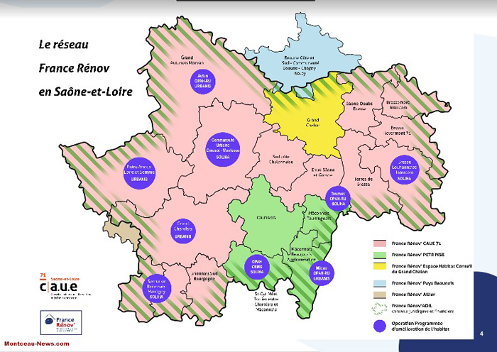 Le Conseil d’Architecture, d’Urbanisme et de l’Environnement (CAUE) de Saône et Loire, se situe à Montceau les mines, 6 quai Jules Chagot, téléphone 03 85 69 05 25. Il a pour mission de développer l’information, la sensibilité et l’esprit de participation du public dans le domaine de l’architecture, de l’urbanisme, de l’environnement et du paysage. Il abrite l’Espace Conseil France Renov’.