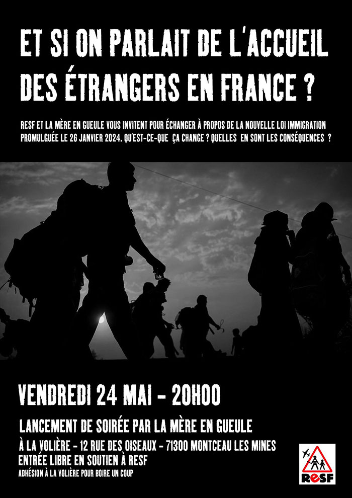 RESF, en partenariat avec la Volière, organise une soirée sur le thème de l’accueil des étrangers en France et une présentation de la nouvelle loi immigration de 2024 le vendredi 24 mai à 20h au 12 rue des oiseaux à Montceau.