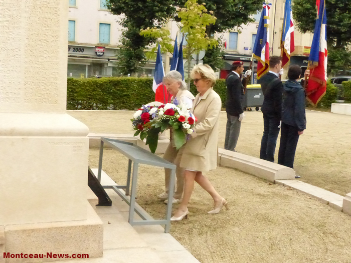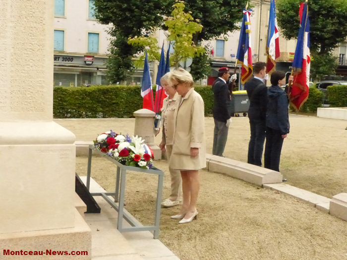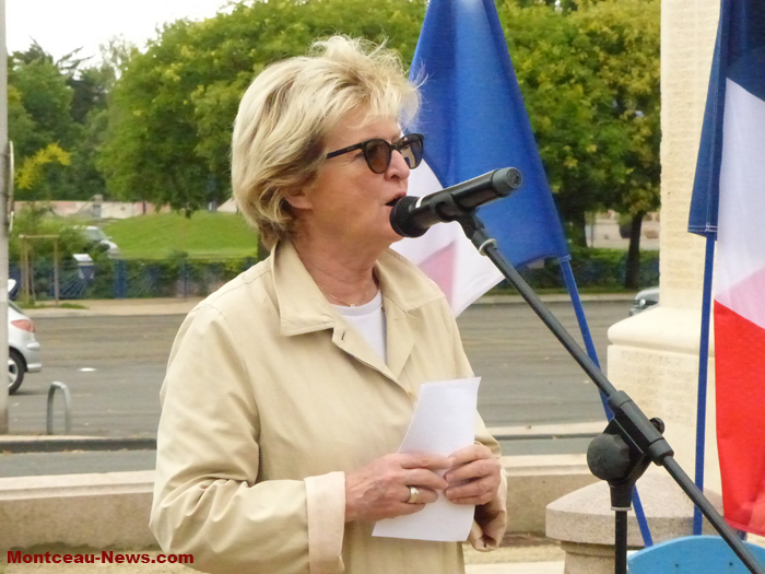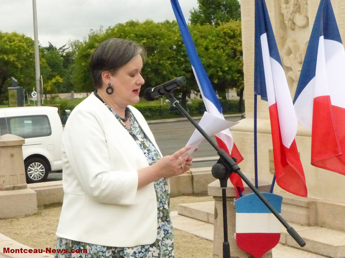 Deux gerbes de fleurs ont été déposées par Mmes Jarrot et Frizot. La maire de la ville a ensuite prononcé un discours en ces termes :