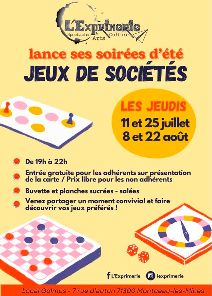 L’Exprimerie organise sa 2ème soirée jeux ce jeudi 25 juillet de 19h 00 à 22h 00 au 7 rue d’Autun à Montceau-les-mines.