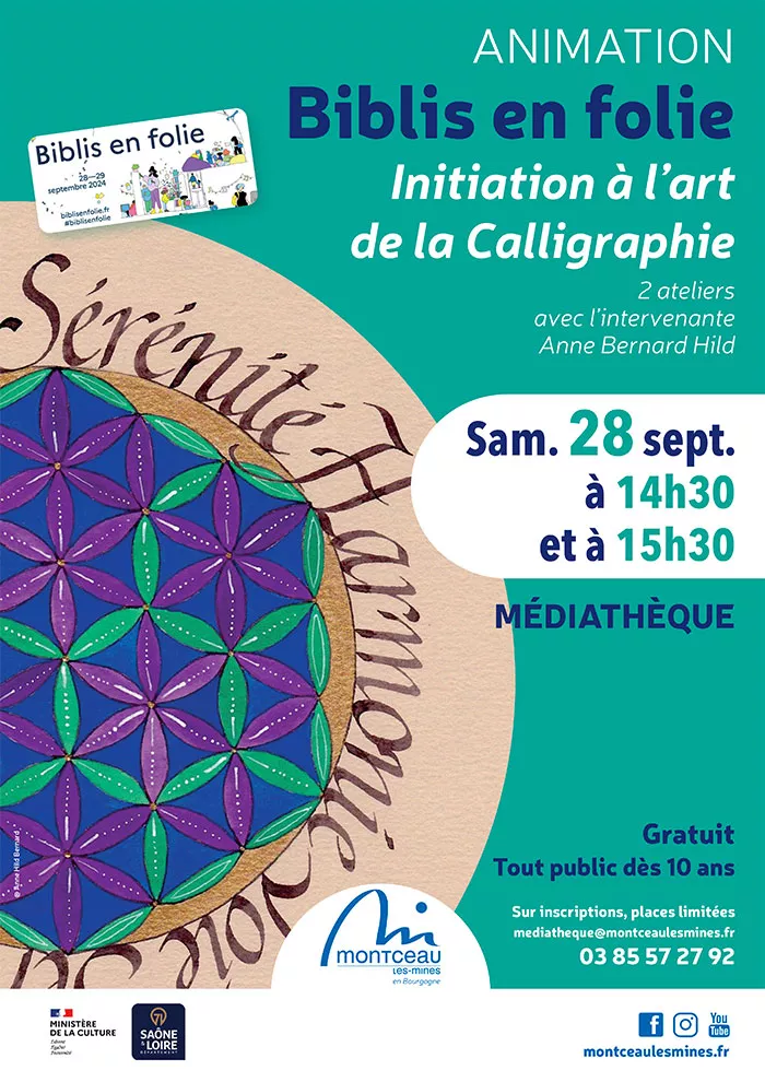 A l’occasion des 1ères journées nationales dédiées aux bibliothèques « Biblis en folie », la médiathèque propose une initiation à la calligraphie. L’intervenante Anne Bernard Hild animera 2 ateliers l’un à 14h30 et le suivant à 15h30.