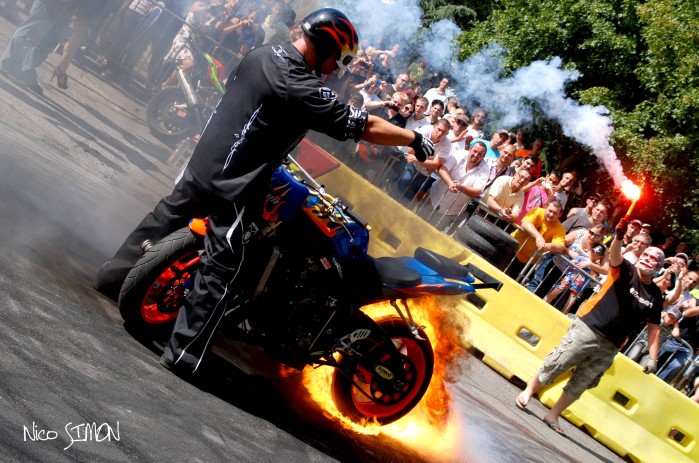Au fil de l’exposition, de superbes prises de vue de Pierre Laborde, telles les illuminations de Lyon, le château de Versailles ou encore la Patrouille de France, celles de Christian Defachelle (qui avoue avoir pris le virus grâce à Pierre) avec un portrait de Jean-Pierre Valabrègue et un portrait de jeune femme en passant par les magnifiques clichés de Nico Simon. A savoir, La moto en feu, les personnages tout de blanc vêtus, fantasmagoriques. Enfin, plein feux sur les prises de vues de Bruno le Hir de Fallois et sa lignée de places de parking handicapés.