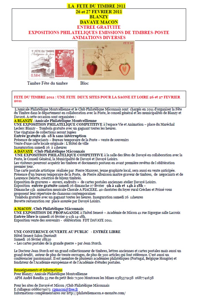 La Fête du timbre les 26 et 27 Février 2011 à Blanzy et à Davayé Mâcon