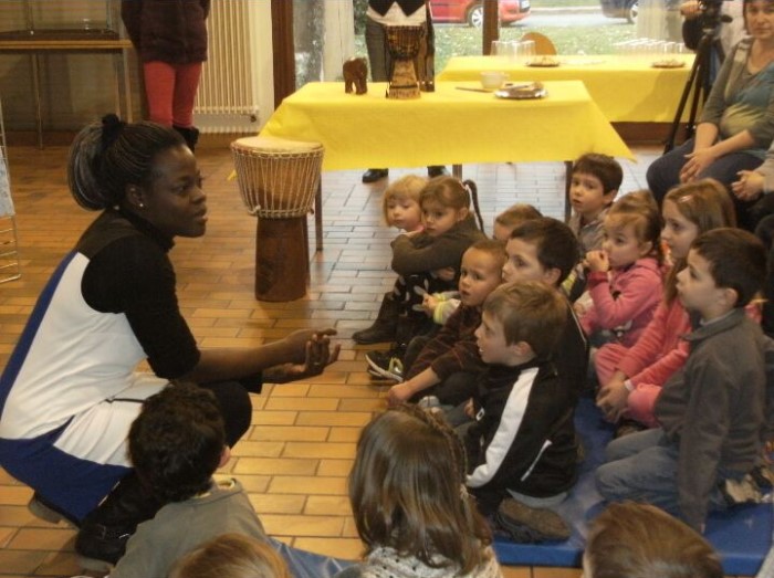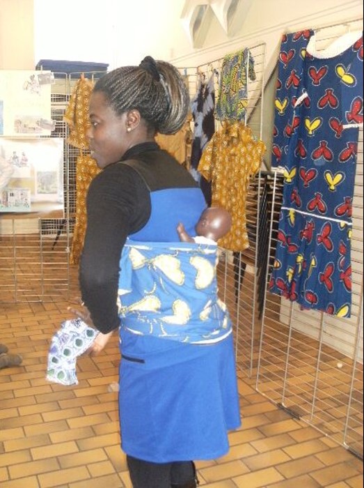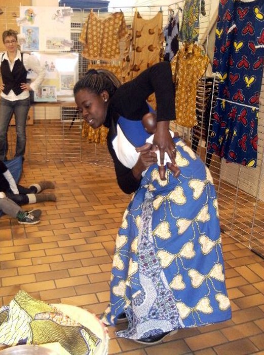 Tout d’abord elle a parlé de son village et de l’école, puis elle a évoqué le rôle des femmes en Afrique et a fait une démonstration sur le portage des bébés, n’hésitant pas à chaque fois à illustrer par des exemples concrets.