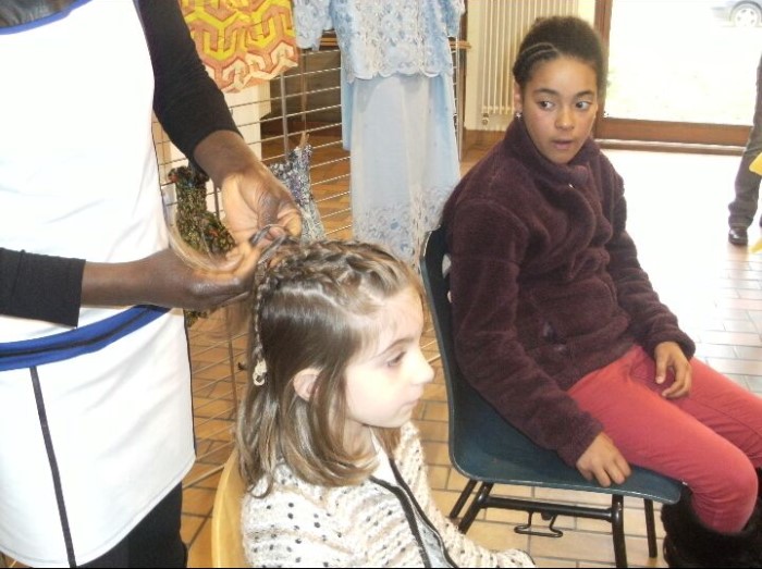 Une exposition de vêtements, d’objet en bois, de coquillages ont agrémenté ce moment, puis elle a fait une démonstration de tresses, de danse et la matinée s’est terminée par la dégustation de délicieux beignets que Julienne a confectionné pour les enfants, après avoir visionné une cassette sur son village.