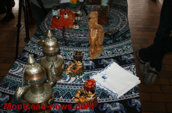 Après cette leçon très ludique, ils ont pu admirer les magnifiques saris apportés par Sumita, les sacs, bonnets, et costumes traditionnels ainsi que des objets en bois, des bijoux et leur signification. Une dégustation de thé , de chura et bhuja( céréales) terminait ce féérique voyage.