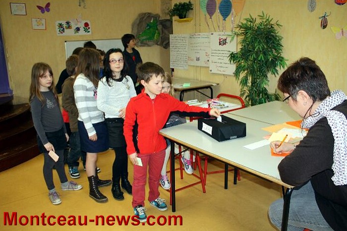 3 élèves étaient candidats à cette élection qui s’est déroulée de façon très démocratique et officielle avec affiches, engagements des candidats, cartes d’électeurs, bulletins de vote, urne, signatures officielles, poinçonnage des cartes, comptages, déclaration du résultat.