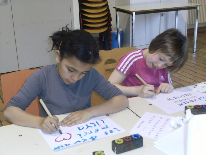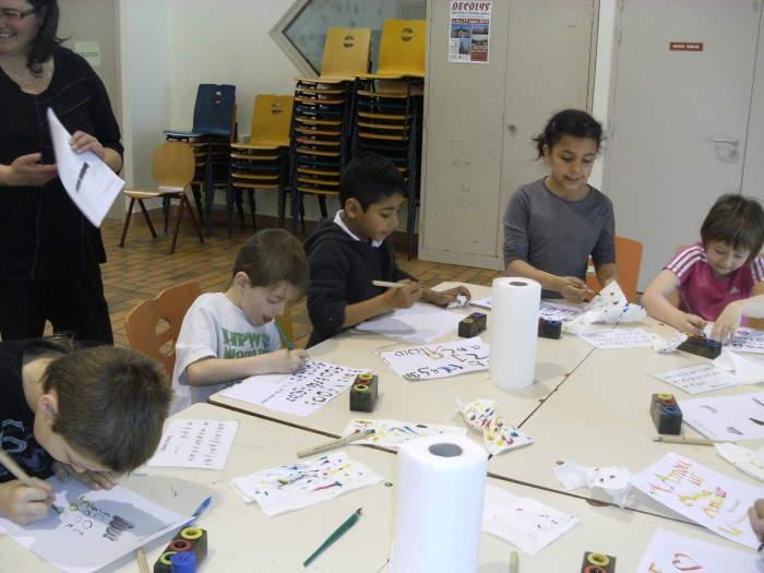 Après une 1ère séance qui a été plus une découverte et une familiarisation avec les instruments et la technique, les enfants on pu mettre en œœuvre les conseils donnés par Claire.Cette intervention s’inscrit dans le projet ‘vivre ensemble’ mené par l’équipe des Rompois, et la séance de mercredi est venue compléter un atelier mené en amont sur ‘Les mots qui chantent’. Au cour de cet atelier, les enfants avaient écrit les mots qui leurs semblent les plus importants, puis ont travaillé sur Word Art. Ce mercredi, les même mots ont été calligraphiés de façon très artistiques.