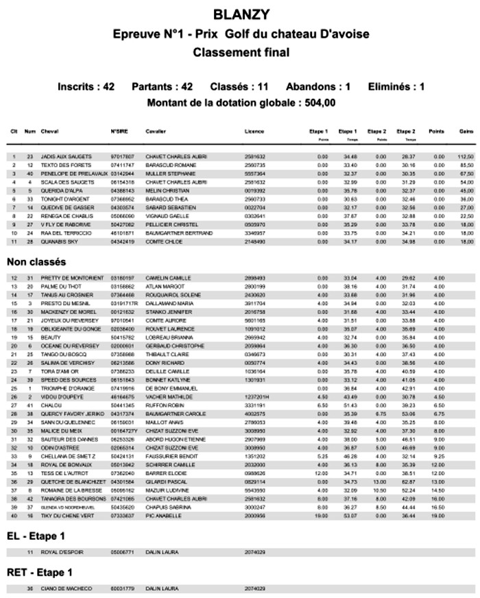 – Epreuve n°1 : PRIX Golf du Château d’Avoise, (Amateur2 Grand Prix – 1m10). L’épreuve a été remporté par Charles Aubri Charvet sur Jadis aux Saugets, devant Romane Barascud sur Texto des Forêts et Stéphane Muller sur Pénélope de Prelavaux.