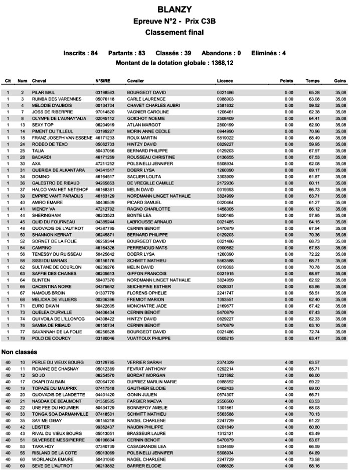 – Epreuve n°2 : PRIX C3B (Préparatoire – 1m15, sans chrono, sans barrage), c’est David Bourgeot sur Pilar Mail qui l’emporte devant Laurence Carle sur Rumba des Varennes et Charles Aubri Chavet sur Mélodie d’Aubois.