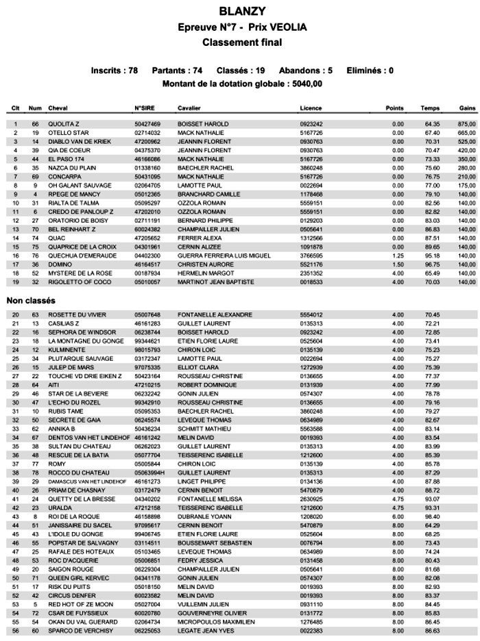 – Epreuve n°7 : PRIX Véolia (PRO 2 Vitesse – 1m35, Barème A, chrono) , épreuve remportée par Harold Boisset sur Quolitaz