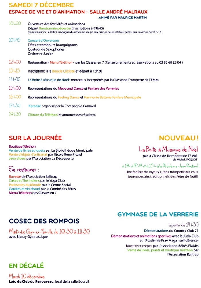 La Ville de Blanzy, en partenariat avec les communes des Bizots, Marigny et Saint-Bérain, participe pour la 10ème fois à l’élan de solidarité national en faveur des personnes atteintes de maladies neuromusculaires et aider la recherche. Le Téléthon aura lieu cette année les 6 et 7 décembre, aux dates nationales.